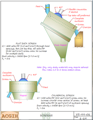 پخش غبار از بالای توری سرند و از پشت و جلوی دستگاه ممکن است انجام شود که محصور سازی آن گزینه مناسبی است. در صورت محصور سازی، هود روی سرند مستقر می‌شود. در سیستم تهویه سرند با توجه به حرکت نوسانی و ارتعاش دستگاه سرند جهت جلوگیری از آسیب به کانال باید به این نکته توجه داشت که هود با یک تکه کانال فلکسیبل به کانال وصل گردد. در سرندهای با توری صاف که شیب دار نصب می‌گردند، هود در قسمت های ابتدایی ورودی بار به سرند نصب می‌گردد. حداقل میزان مکش هود در این نوع سرندها 200acfm/ft2 به ازای سطوح باز سرند است اما این میزان نباید از 50acfm/ft2 از سطح سرند کمتر باشد. مکش ذکر شده فقط در یک طبقه از سرند اهمیت دارد و تعداد طبقات در آن تاثیری ندارد. در تهویه سرندهای استوانه ای نیز باید محصور سازی صورت گیرد. در این حالت میزان مکش هود  400acfm/ft2 به ازای سطوح باز محفظه محصور سرند است اما این میزان نباید از 100acfm/ft2 به ازای سطح سرند کمتر باشد. محصور سازی باید محل تغذیه سرند تا خروجی آن را شامل شود. در بارهای خشک و غبارهای با غلظت بسیار زیاد میزان مکش در سیستم تهویه سرند ممکن است تا دو برابر بیشتر در نظر گرفته شود.